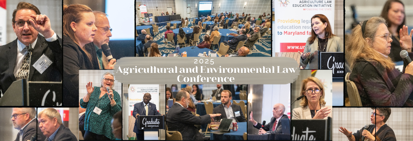 ALEI hosts an Agricultural and Environmental Law Conference annually. This event attracts agricultural service providers, attorneys, educators, environmentalists, producers, landowners, policymakers, and students to discuss the complex intersection of environmental regulation and agriculture in Maryland. ALEI prides itself on hosting an event that brings agriculture and conservation experts together in a forum that allows for exchanging ideas and education for conference attendees on current legal topics of interest.